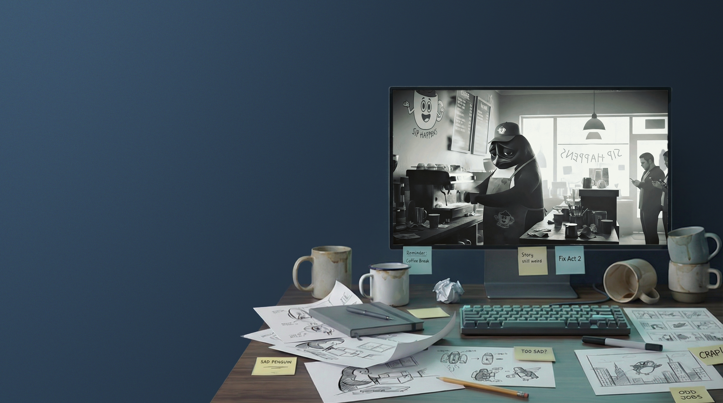 The process was less “type a prompt and magic happens” and more like directing a slightly unpredictable robot film crew. I built the project around a hero frame of a melancholy penguin and used that as the visual anchor while generating dozens of short scenes across different AI video models. Many of the outputs were strange, most were unusable, and every once in a while the machine produced something unexpectedly perfect.