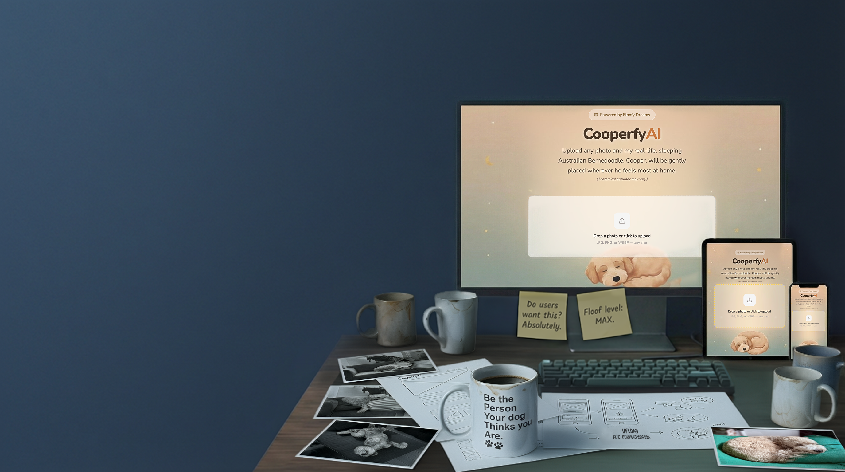 CooperfyAI started as a joke with my wife. One night I told her that someday I was going to build an app in honor of our three-year-old Australian Bernedoodle, Cooper, whose primary talent is sleeping. The concept was simple. Upload any photo and the app quietly inserts Cooper somewhere into the scene, usually asleep, an homage to his lifelong commitment to napping on every surface in our house.